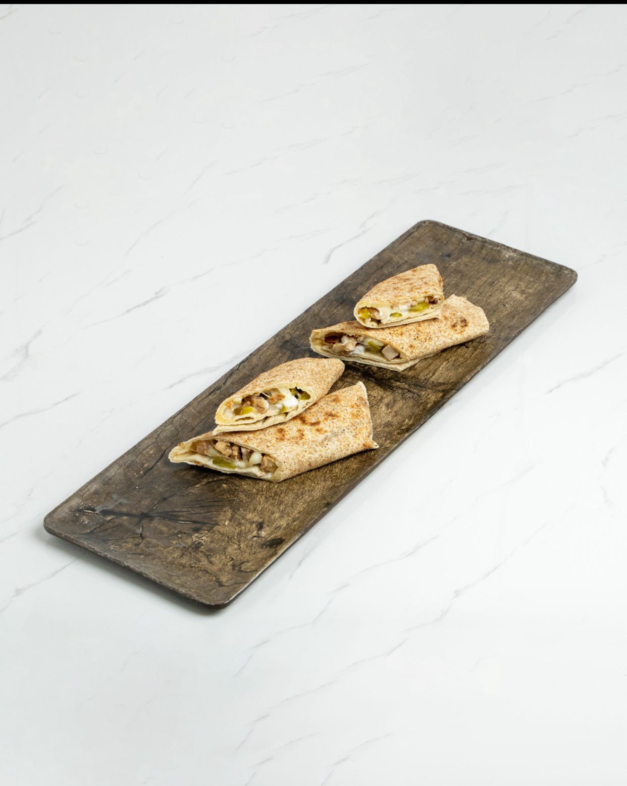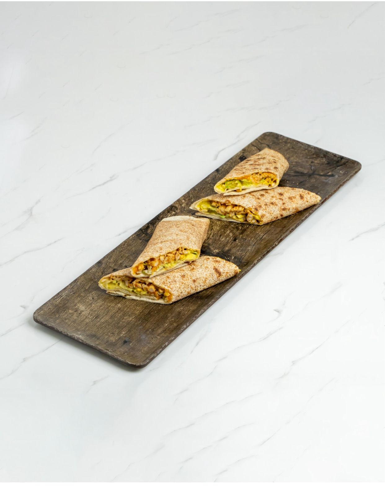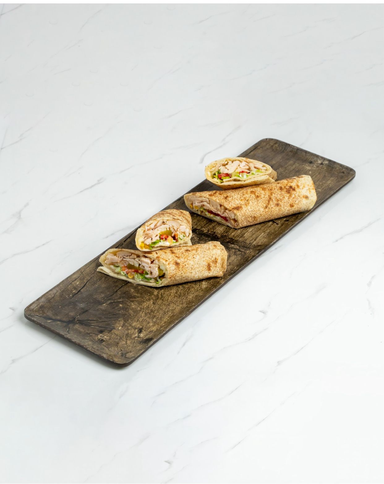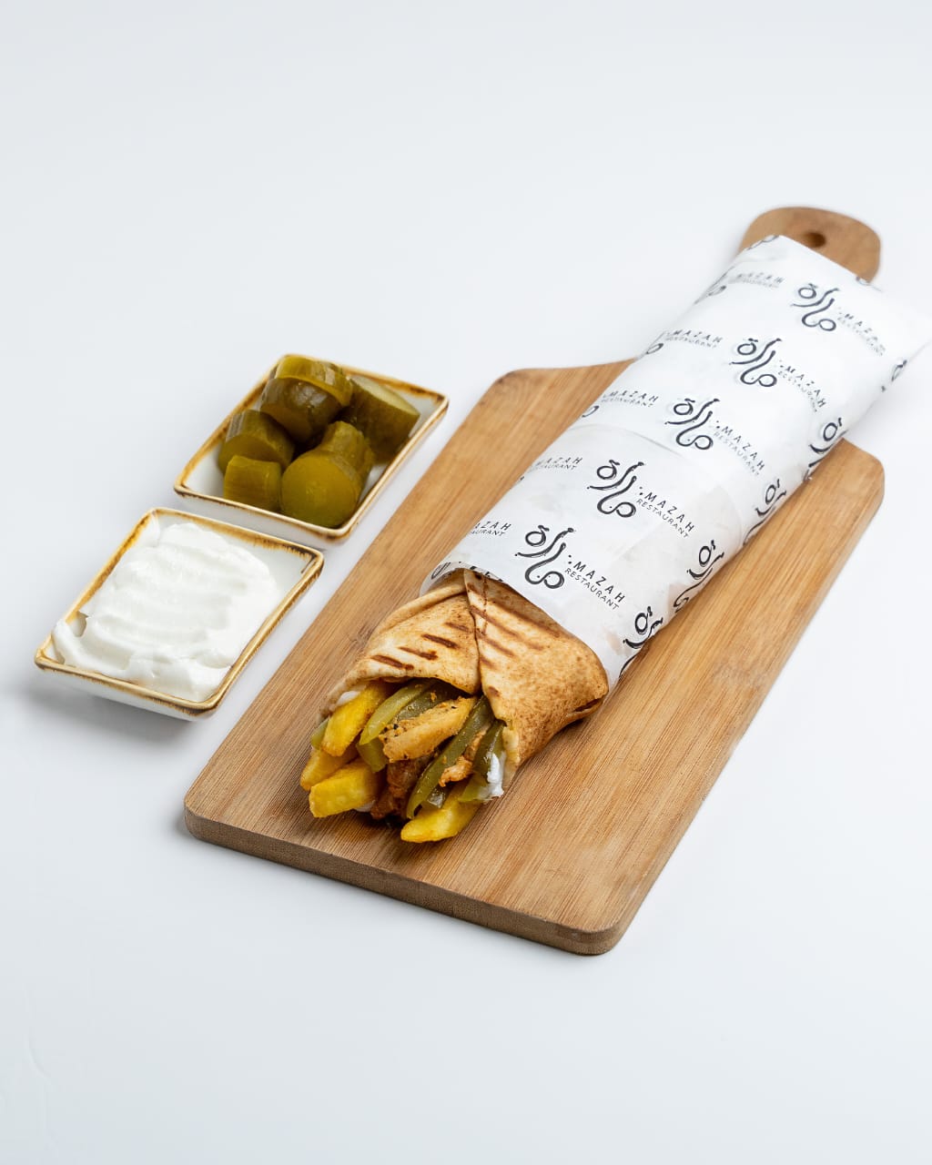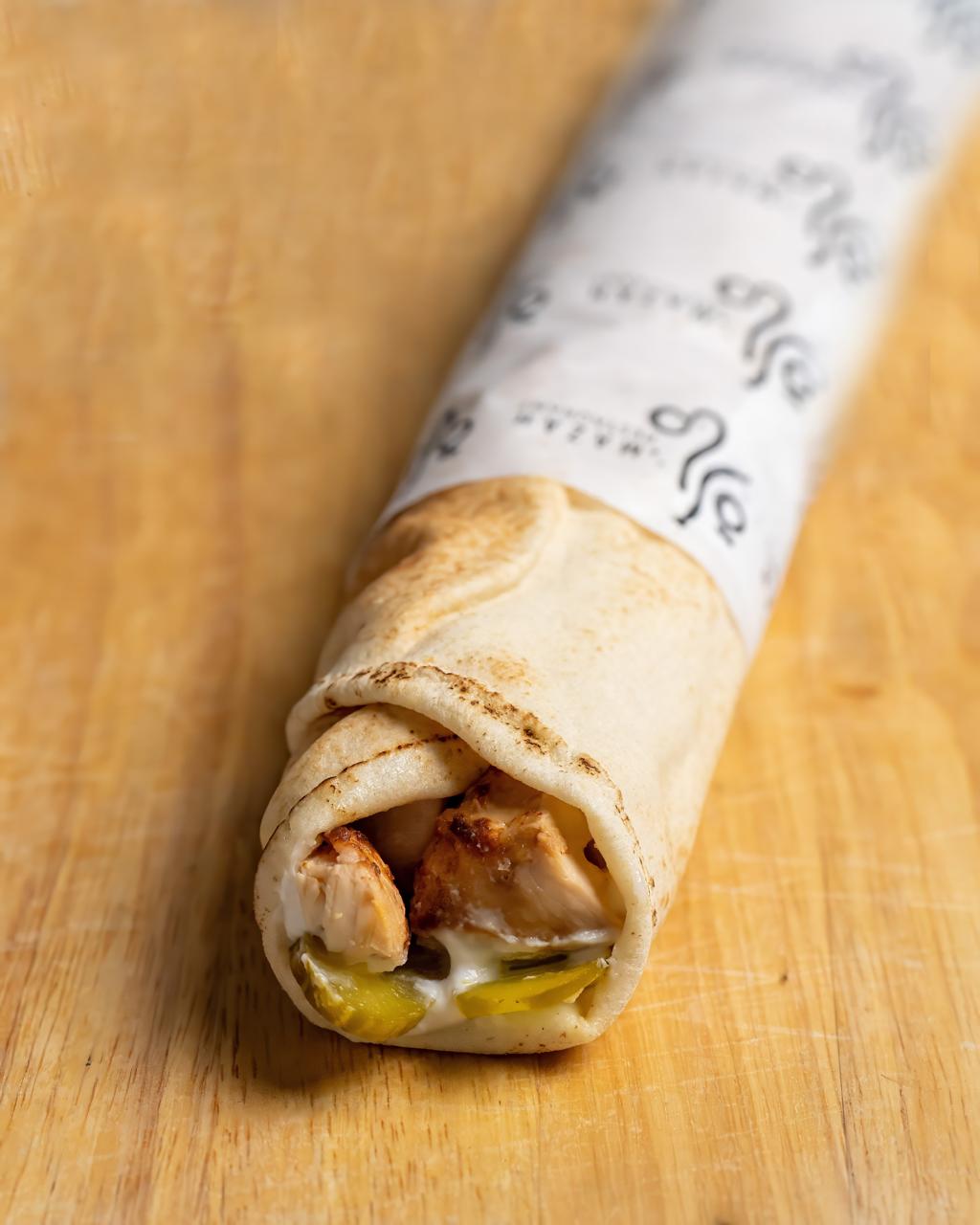 Chicken, lettuce, corn, pickles, tomato, cheese with mayo garlic sauce
