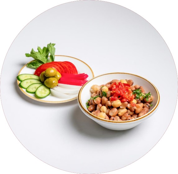 Fava beans seasoned with lemon juice and garlic served with vegetables platter
