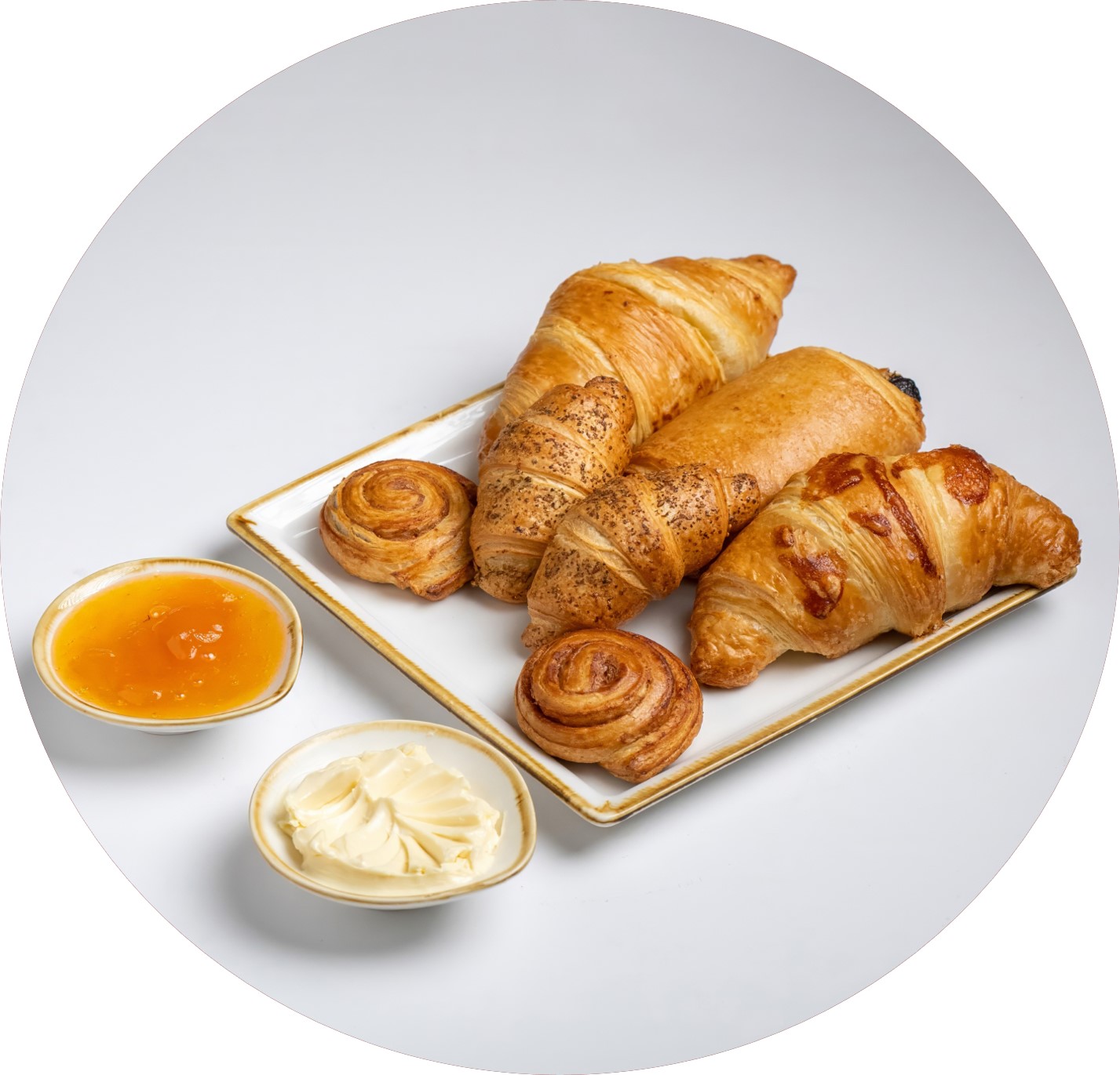 selection of croissant, cinnamon and toast, jam, butter, orange, tea or coffee