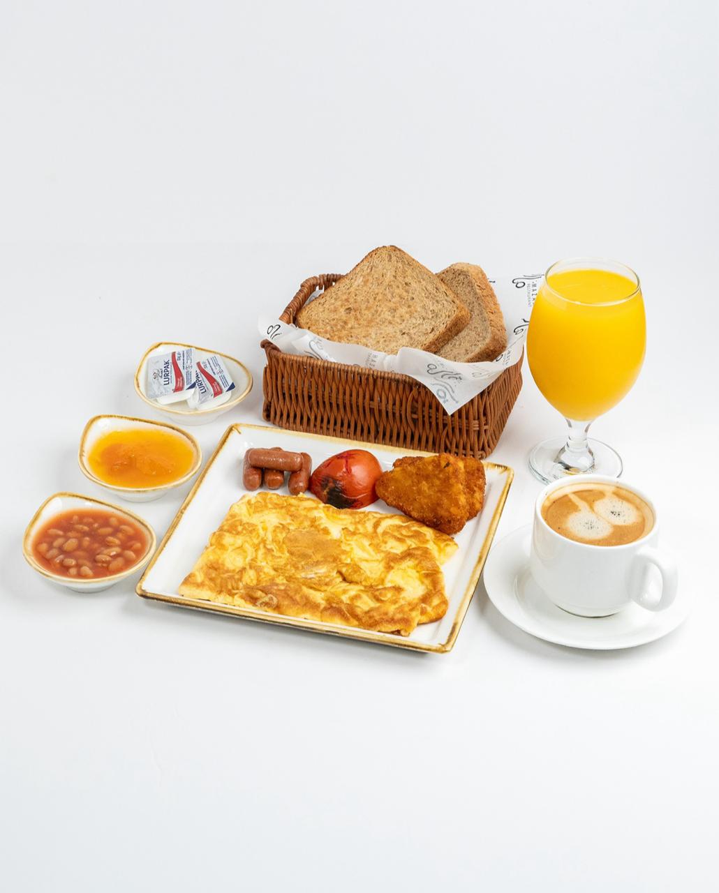 Your choice of eggs, beans, sausage, hash brown, jam butter and orange juice and coffee or tea