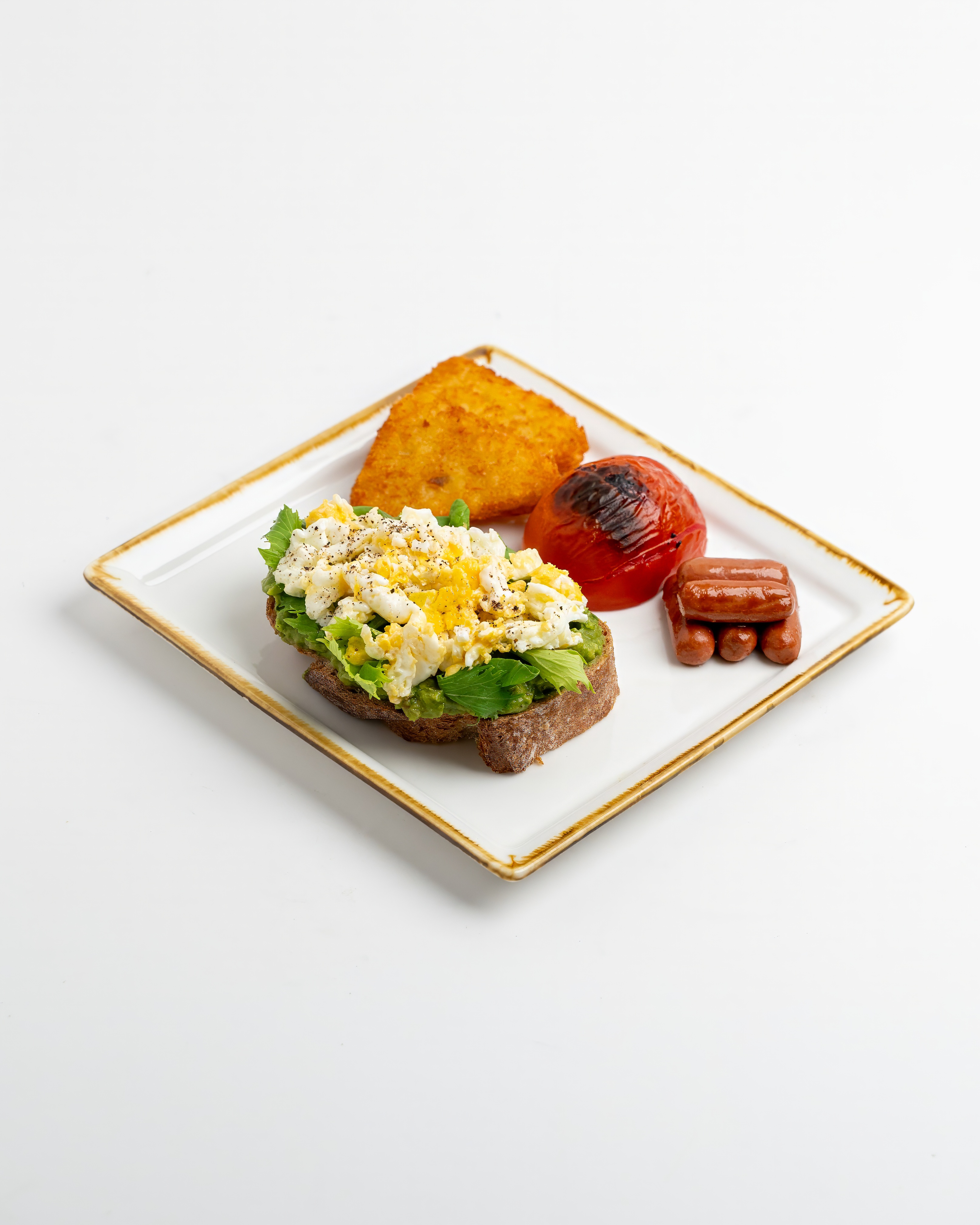 Sourdough, guacamole, mix Rocca, Scrambled served with hash brown and sausage