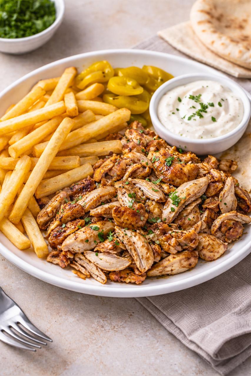 Minced chicken served with French fries, grilled onion and grilled tomatoes and bewaz and garlic paste