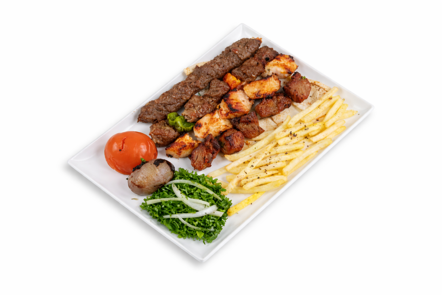 10 skewers of lamb ,tawouk and kafta Served with Fries, homos ,fatouche.