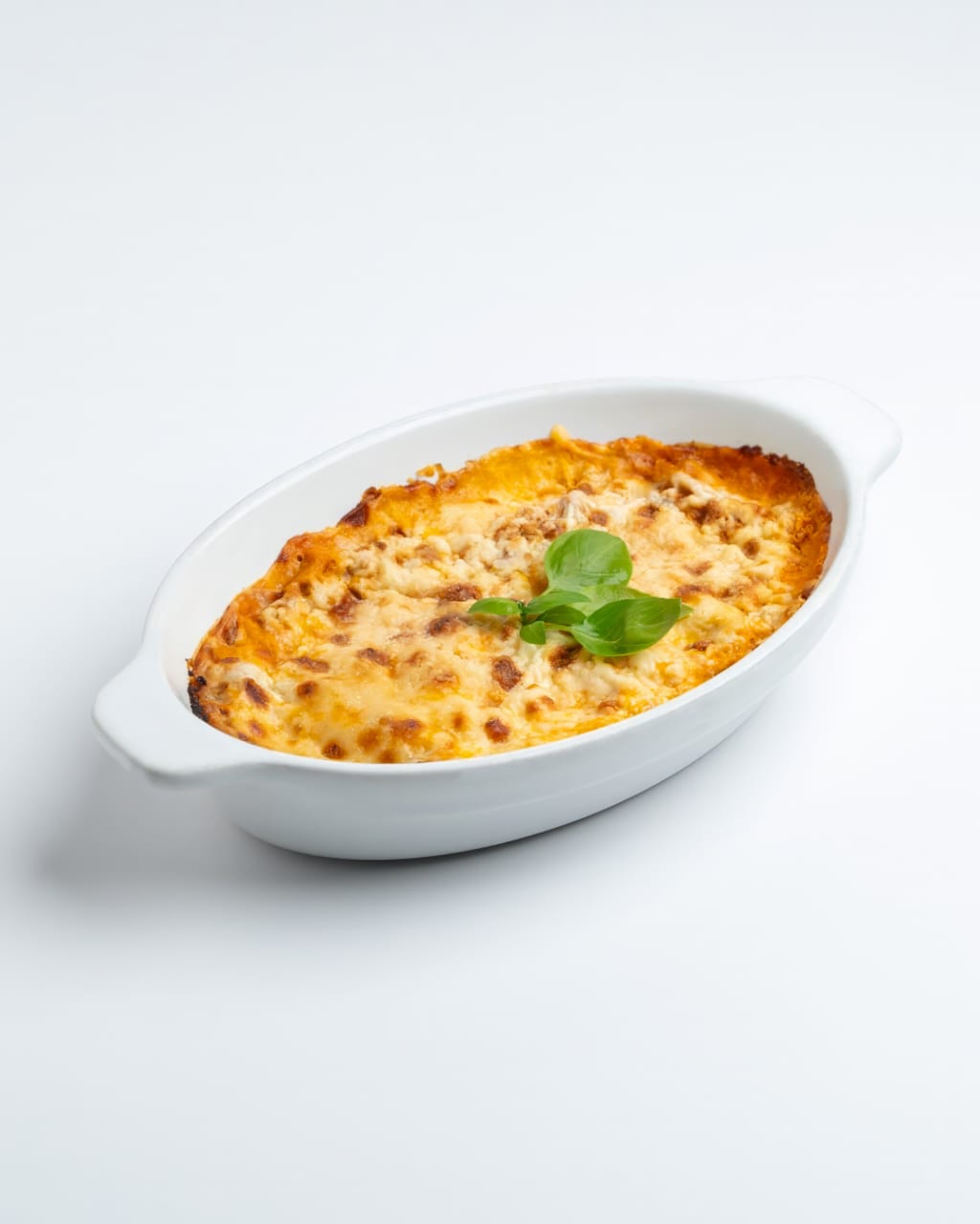 Minced meat with tomato, bachamel sauce and parmesan cheese